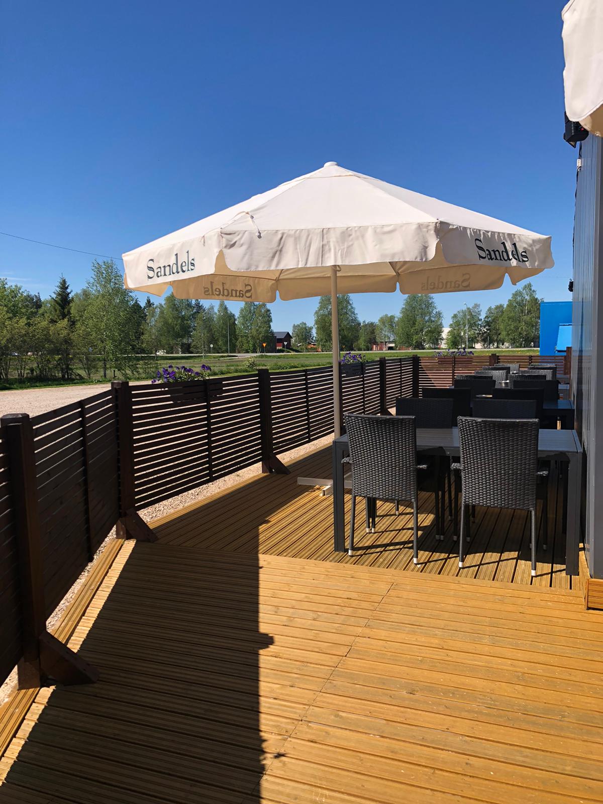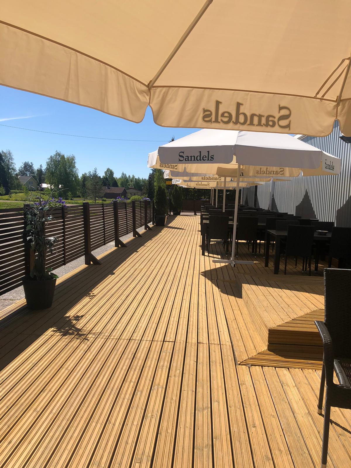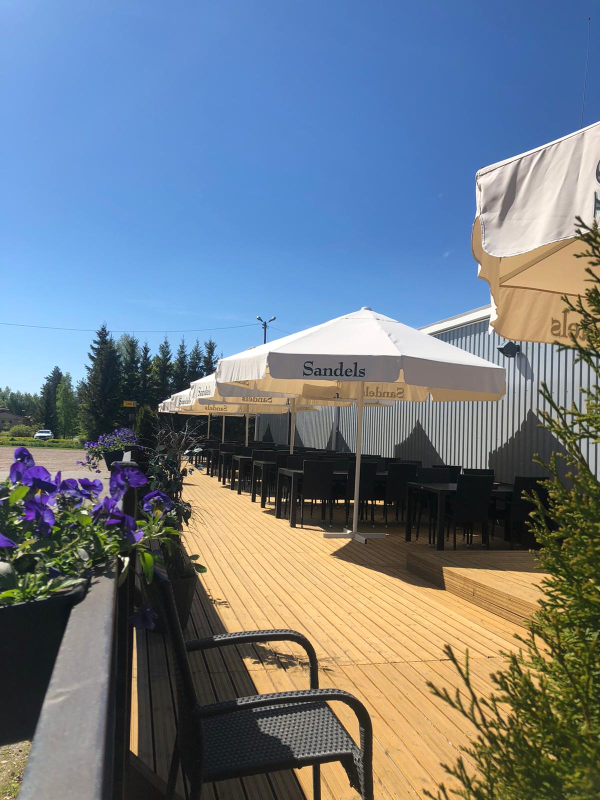 Meillä on terasseja lähes jokaiseen ilmansuuntaan. Kesällä aurinko paistaa aamusta iltaan aina jollekin terasseista. Terassialueet ovat myös anniskelualuetta.